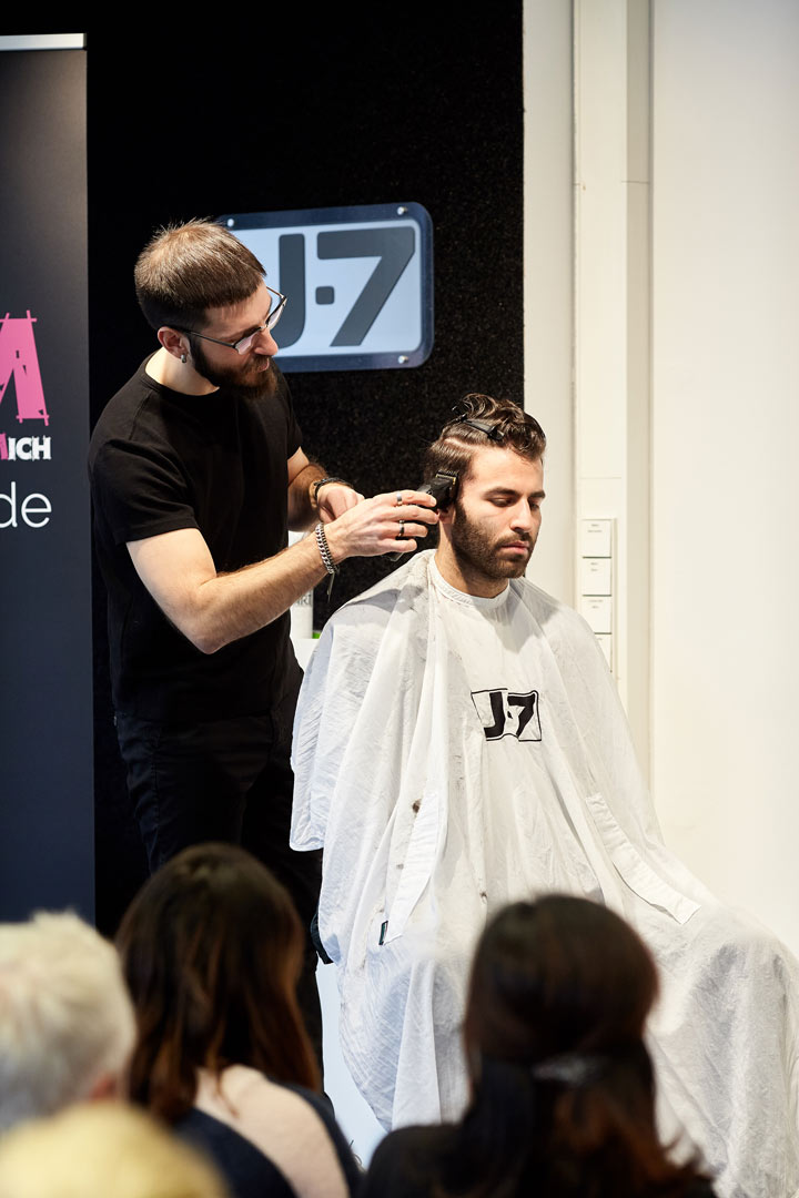 Die beiden j7 Top-Stylisten Christopher Gedler und Stefan Jaksic zeigten in Stuttgart an vier tatsächlich sehr maskulinen Models unterschiedliche Interpretationen der Frisuren- und Bartmode. Beim Haarschnitt nach wie vor en vogue: der klassische Fade Cut mit kurzen Seiten und Nackenkonturen, gerne auch im Rockabilly-Style. Um die gewünschte Portion Männlichkeit zum Ausdruck zu bringen, sei es bei der Erstellung der Cuts und Styles wichtig, „eckig und nicht rund zu denken“, waren sich Chris und Stefan einig.