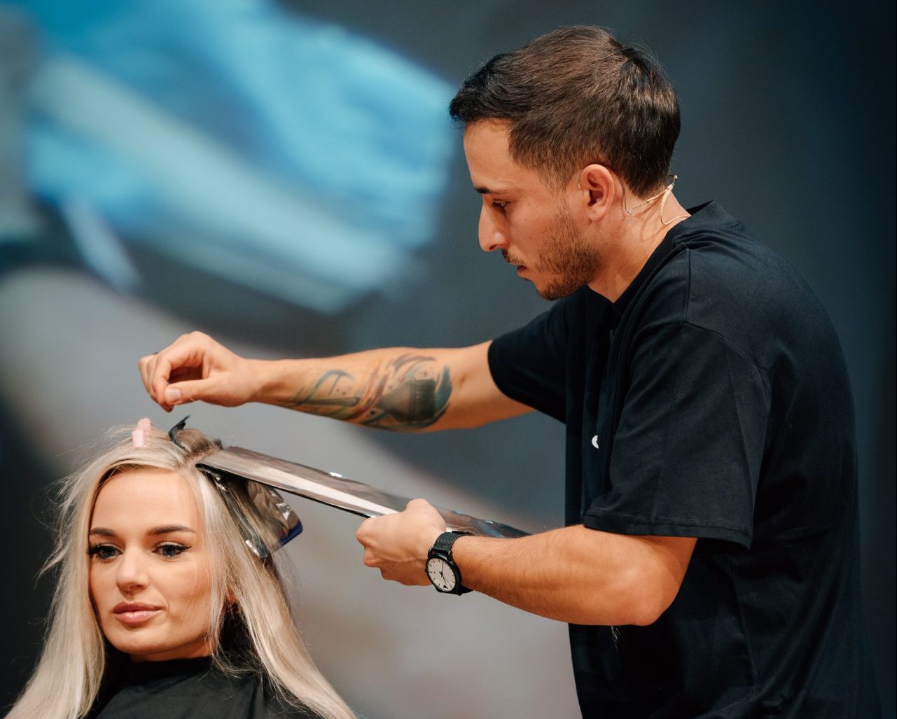 Zum Abschluss präsentierte Cenk Yesil die fertigen Farbmodelle seines Workshops, bevor Niclas (@Styledbyniclas) mit „The Art of Extensions“ einer beeindruckenden Live-Haarverlängerung samt Verdichtung das große Finale einleitete – und dabei jede Publikumsfrage mit Praxiswissen beantwortete.