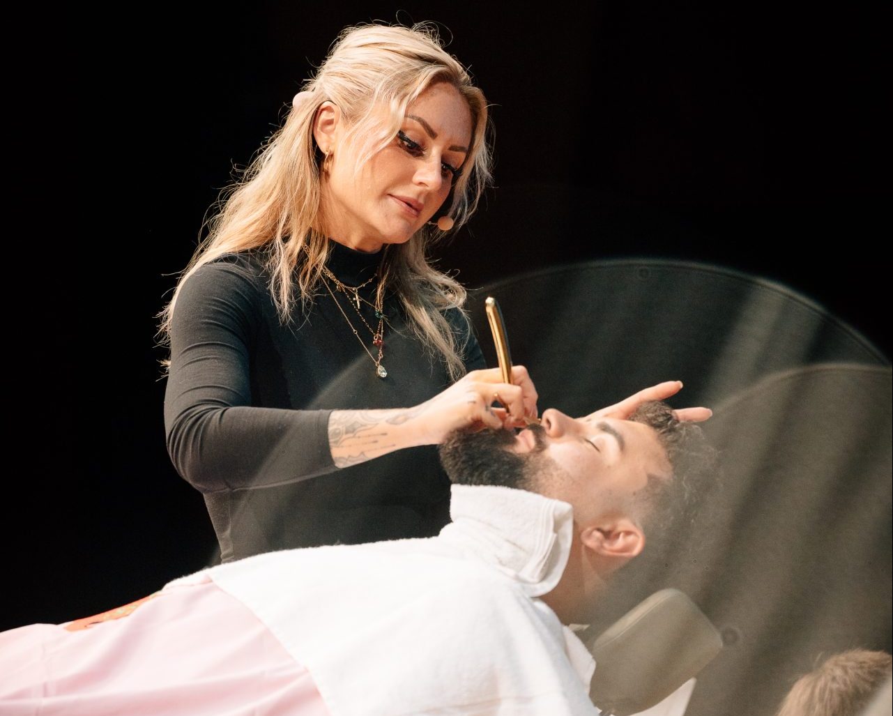 Nach einer gemeinsamen Mittagspause mit köstlichem Catering übernahm Cat (@itsthebarbercat) die Bühne. Mit „Next Level Grooming“ zeigte sie, wie sich Barbering durch präzise Techniken, luxuriöse Rasur und Pflegeerlebnisse neu interpretieren lässt. Danach folgte ein ehrlicher und inspirierender Talk von Kat & Maya („@educationbykat“ und „@mayareckgert“) zum Thema „Positionierung und Social Media“, der für viele Aha-Momente im Publikum sorgte.