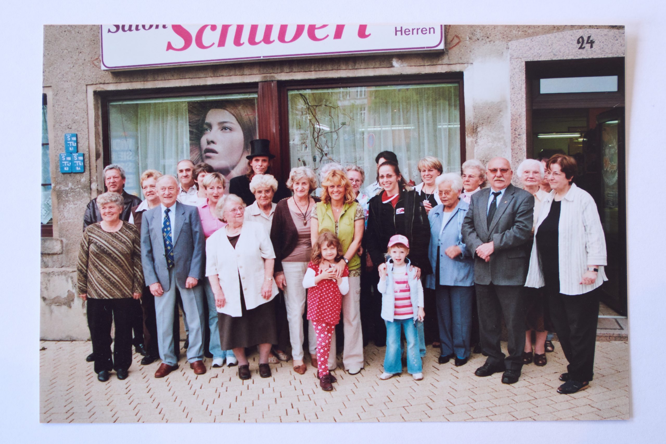 Das Haarpflegehaus Schubert blickt auf eine 137-jährige Tradition zurück. Das Foto aus den frühen 2000ern zeigt die Friseurfamilie, Stammkund*innen, Freund*innen und die Nachbarschaft. Lara Beck steht als kleines Mädchen schon damals im Zentrum, gemeinsam mit ihrer Uroma, Oma, Mama und der Schwester der Oma, die das Geschäft vor ihr führte. // Haarpflegehaus Schubert